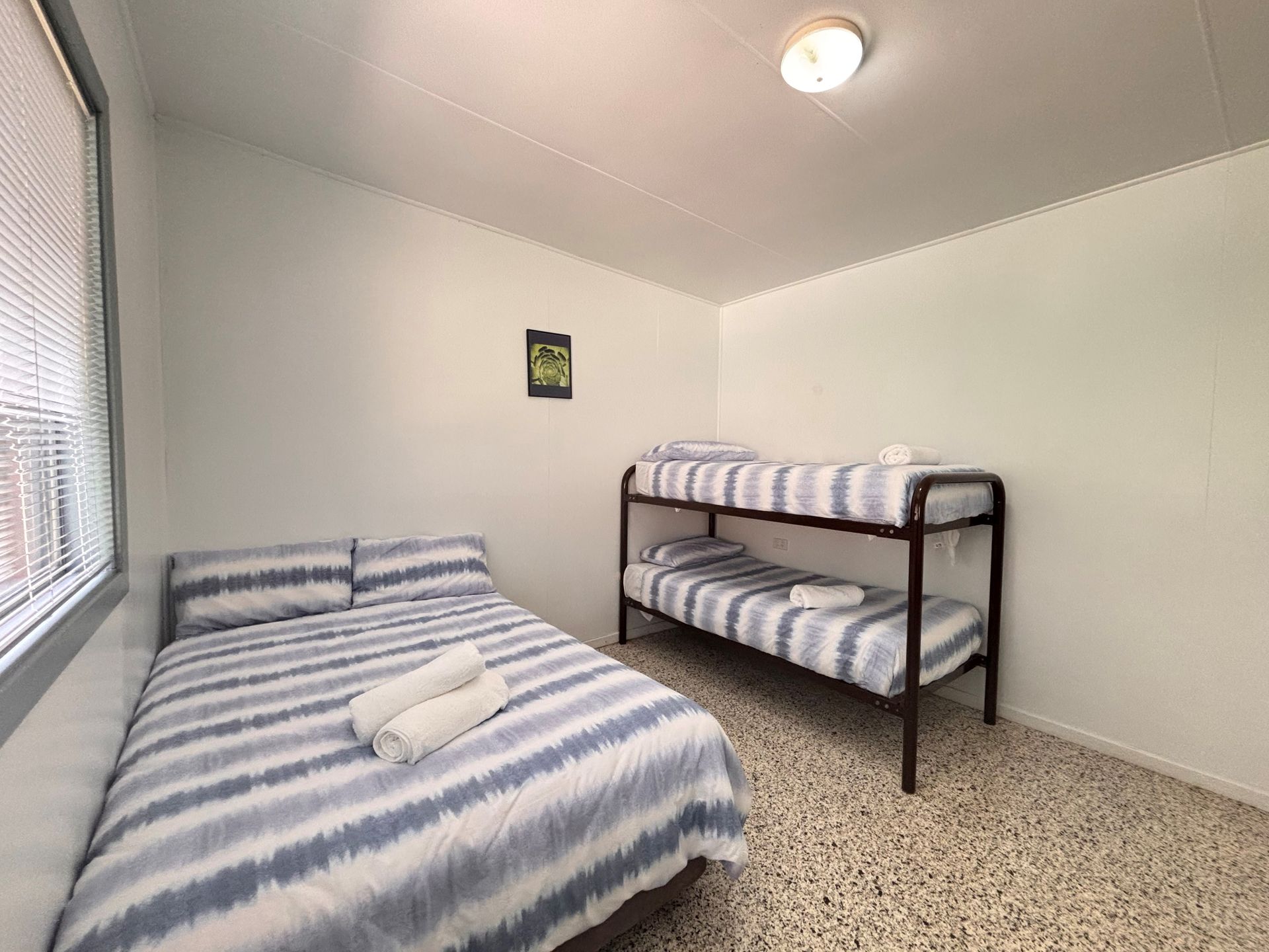 Motel type rooms with made up queen bed and ensuite