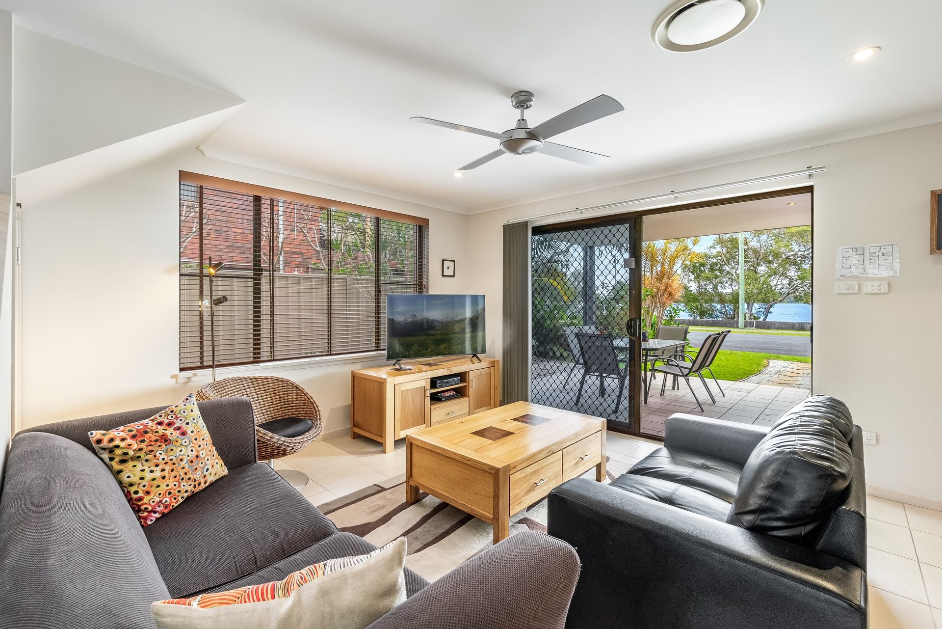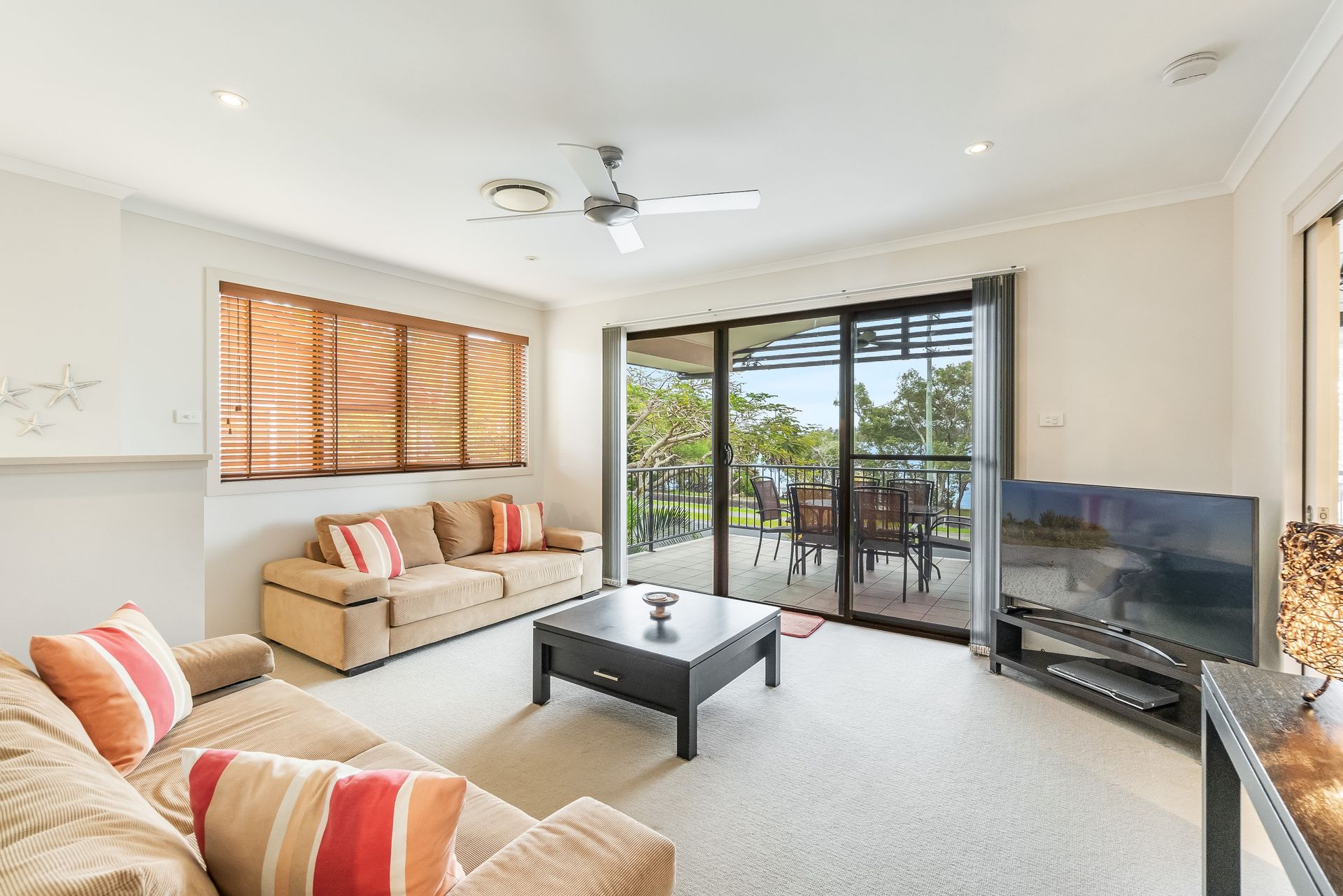 Inside, there’s plenty of room for everyone to spread out. Two generous living areas with TV/DVD setups mean the kids can enjoy their space while the adults relax upstairs — or everyone can come together for a cosy movie night after a day at the beach. The atmosphere is calm, airy and designed for easy holiday living.