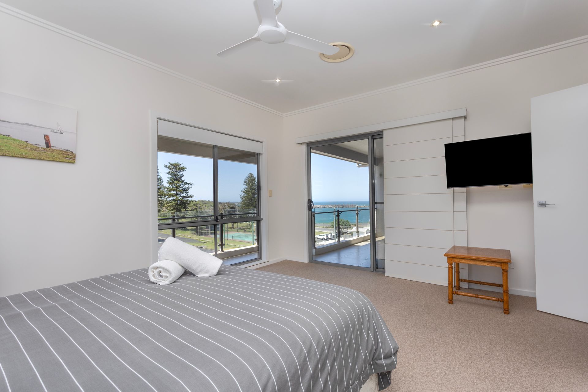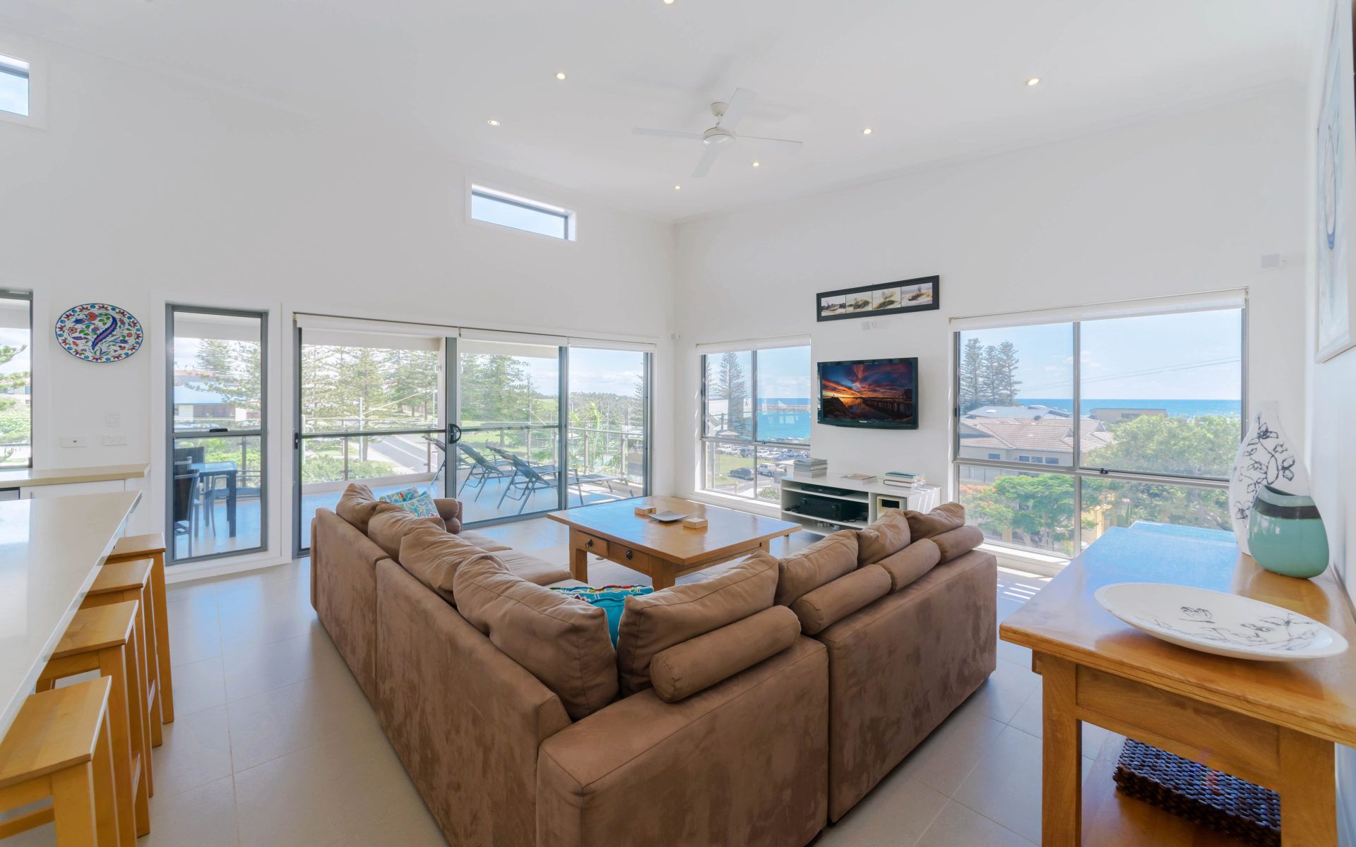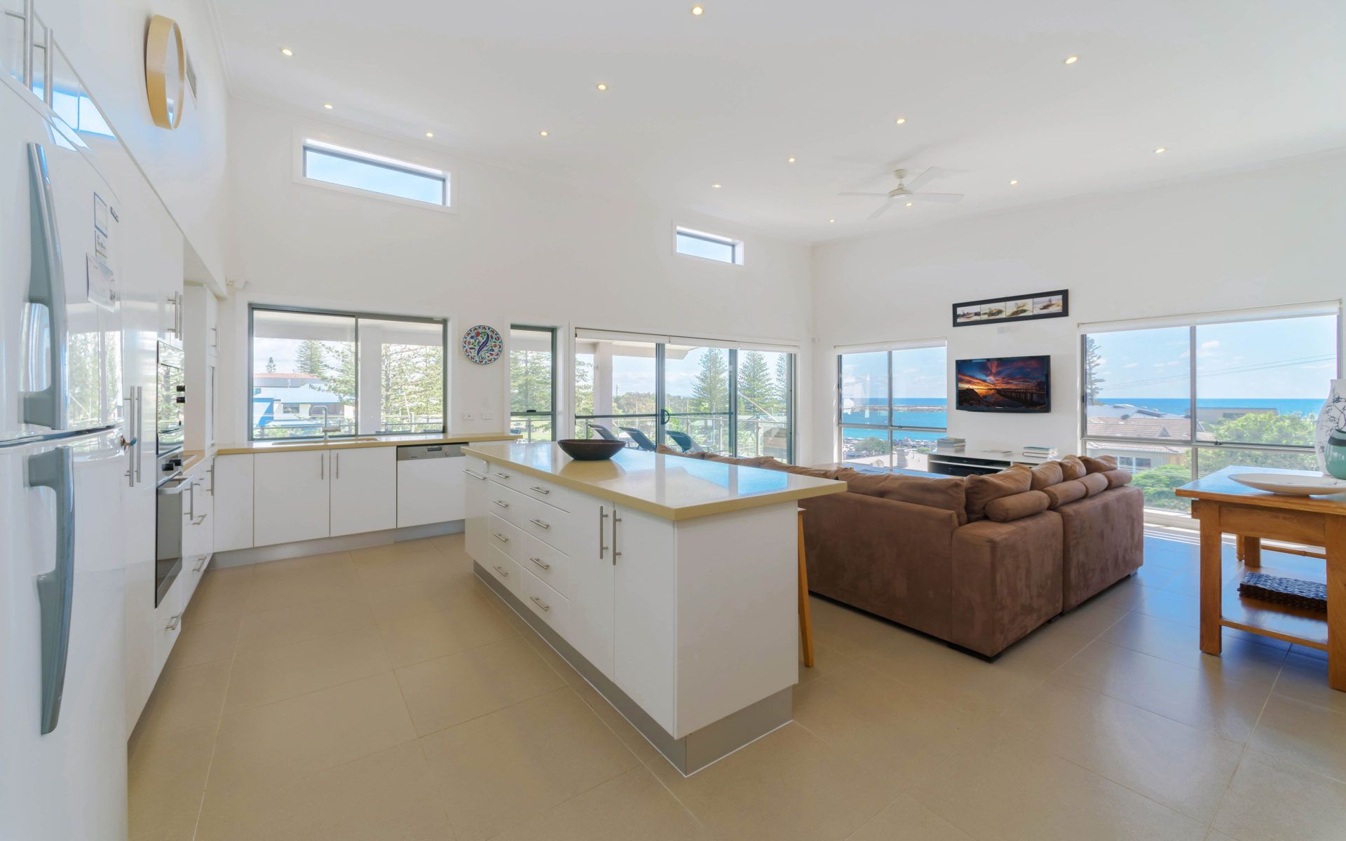 The open-plan living area, complete with a big-screen TV and ceiling fans, flows seamlessly onto a sun-drenched balcony. Here, you can soak in the breathtaking ocean views while enjoying a BBQ or unwinding in the outdoor seating area.