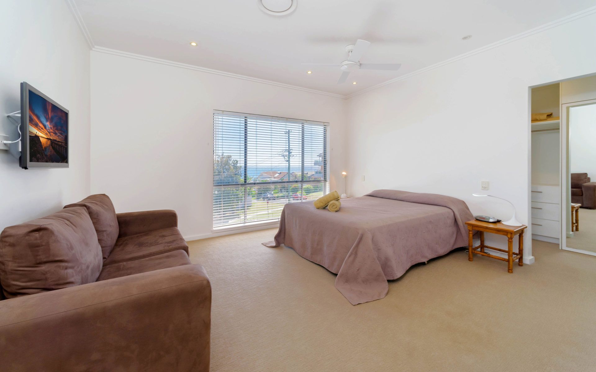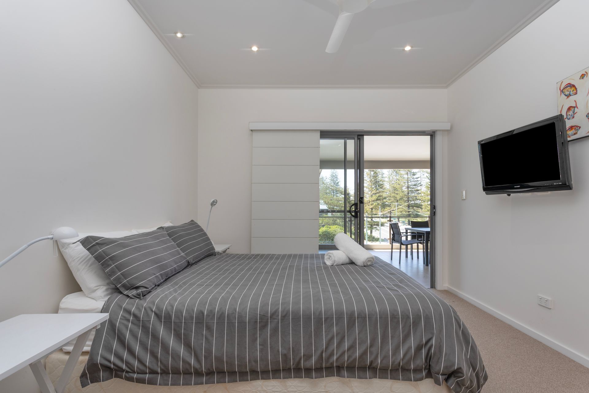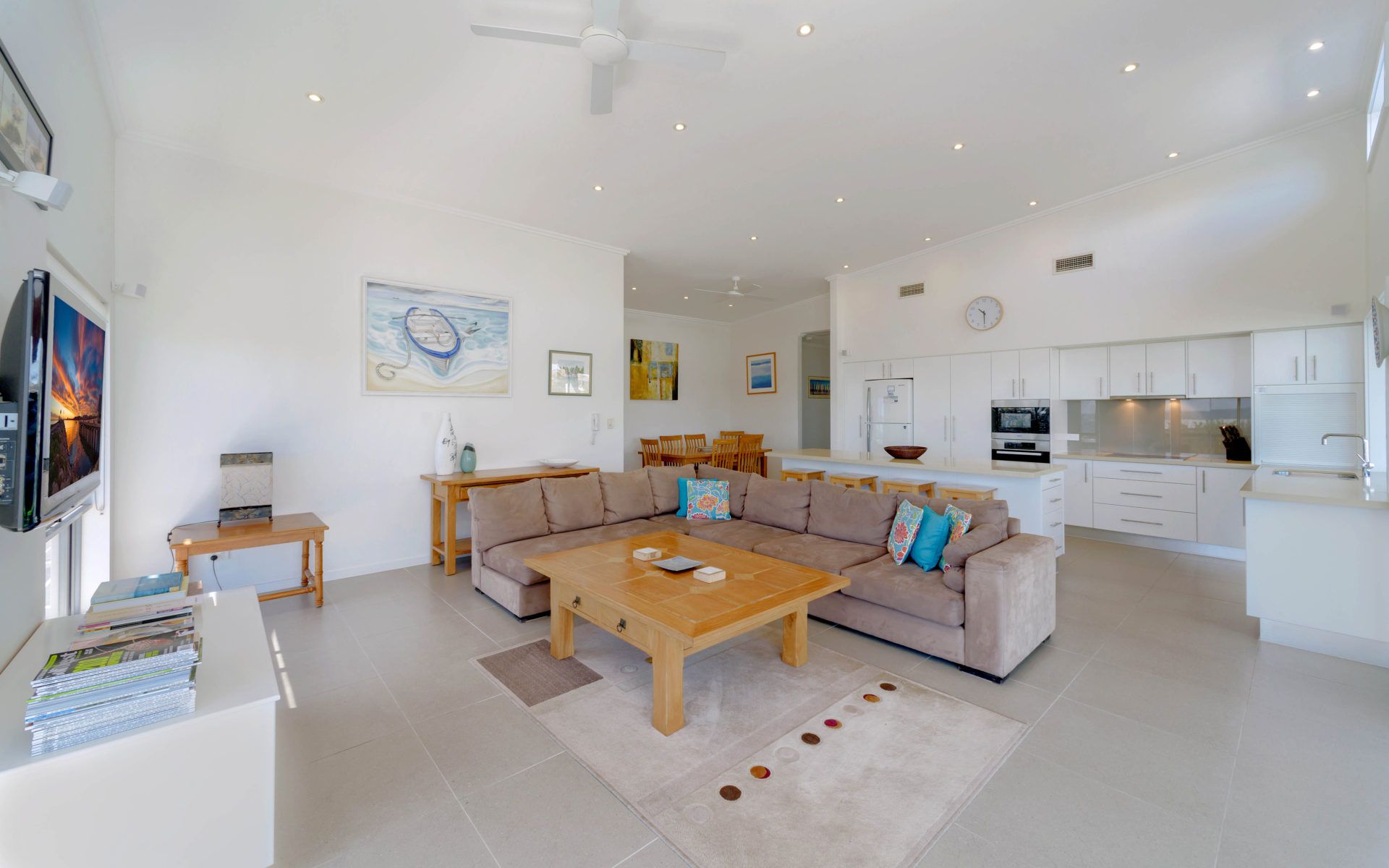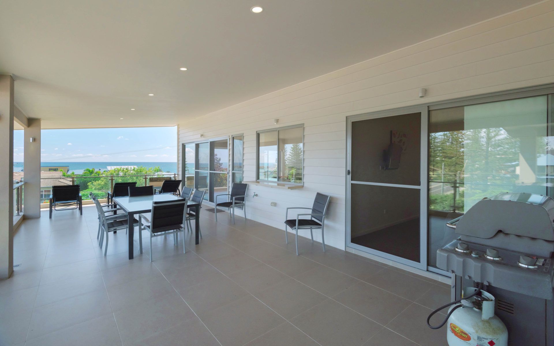 The open-plan living area, complete with a big-screen TV and ceiling fans, flows seamlessly onto a sun-drenched balcony. Here, you can soak in the breathtaking ocean views while enjoying a BBQ or unwinding in the outdoor seating area.