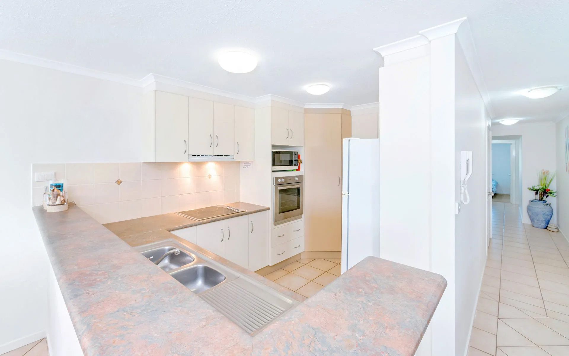 Designed for easy beachside living, the open-plan lounge and dining area features floor-to-ceiling windows that capture sweeping ocean views and let in plenty of natural light. The fully equipped kitchen includes a microwave, dishwasher, oven, and toaster, making meal preparation effortless.