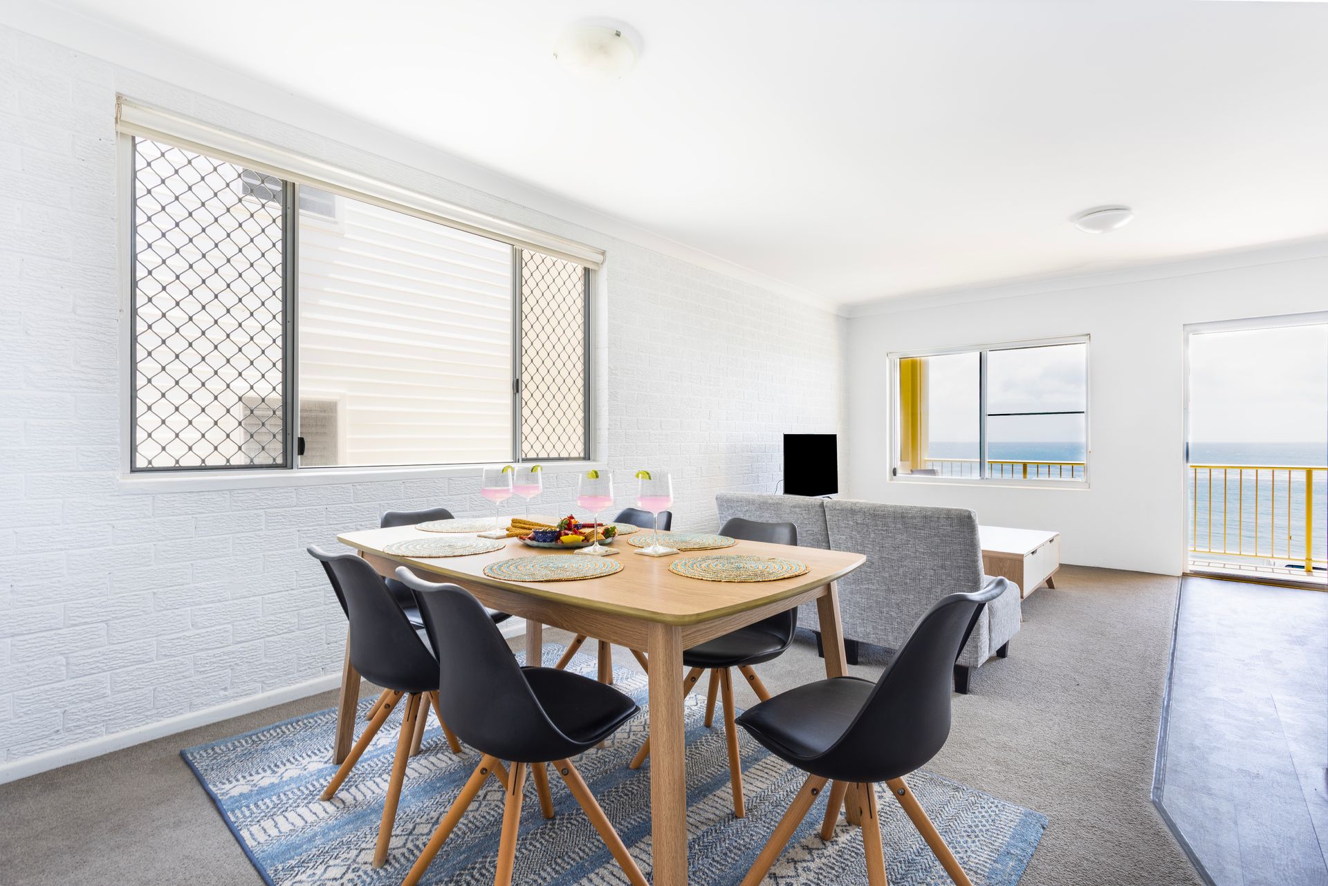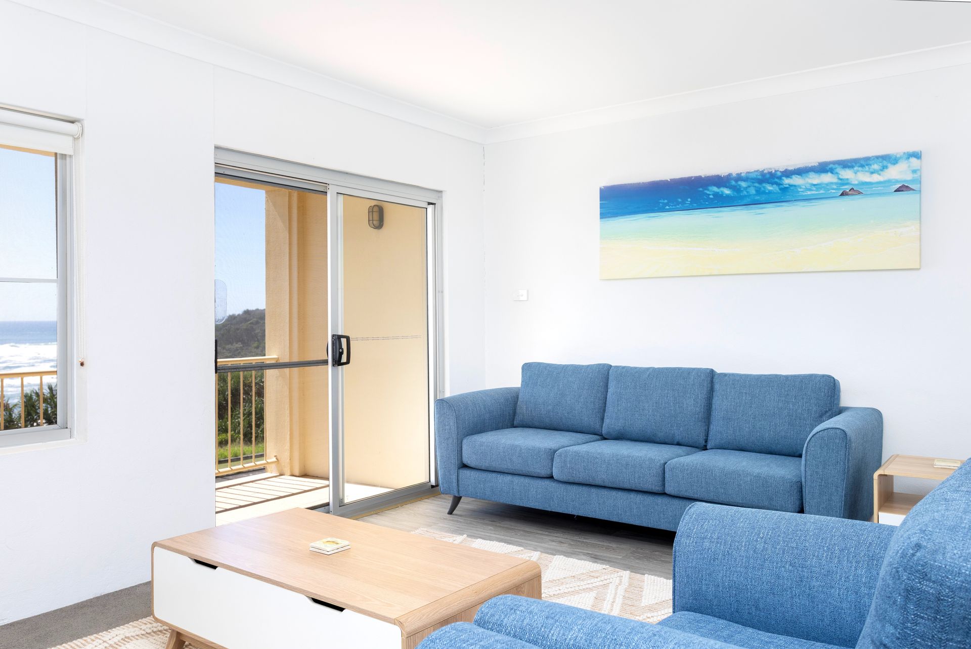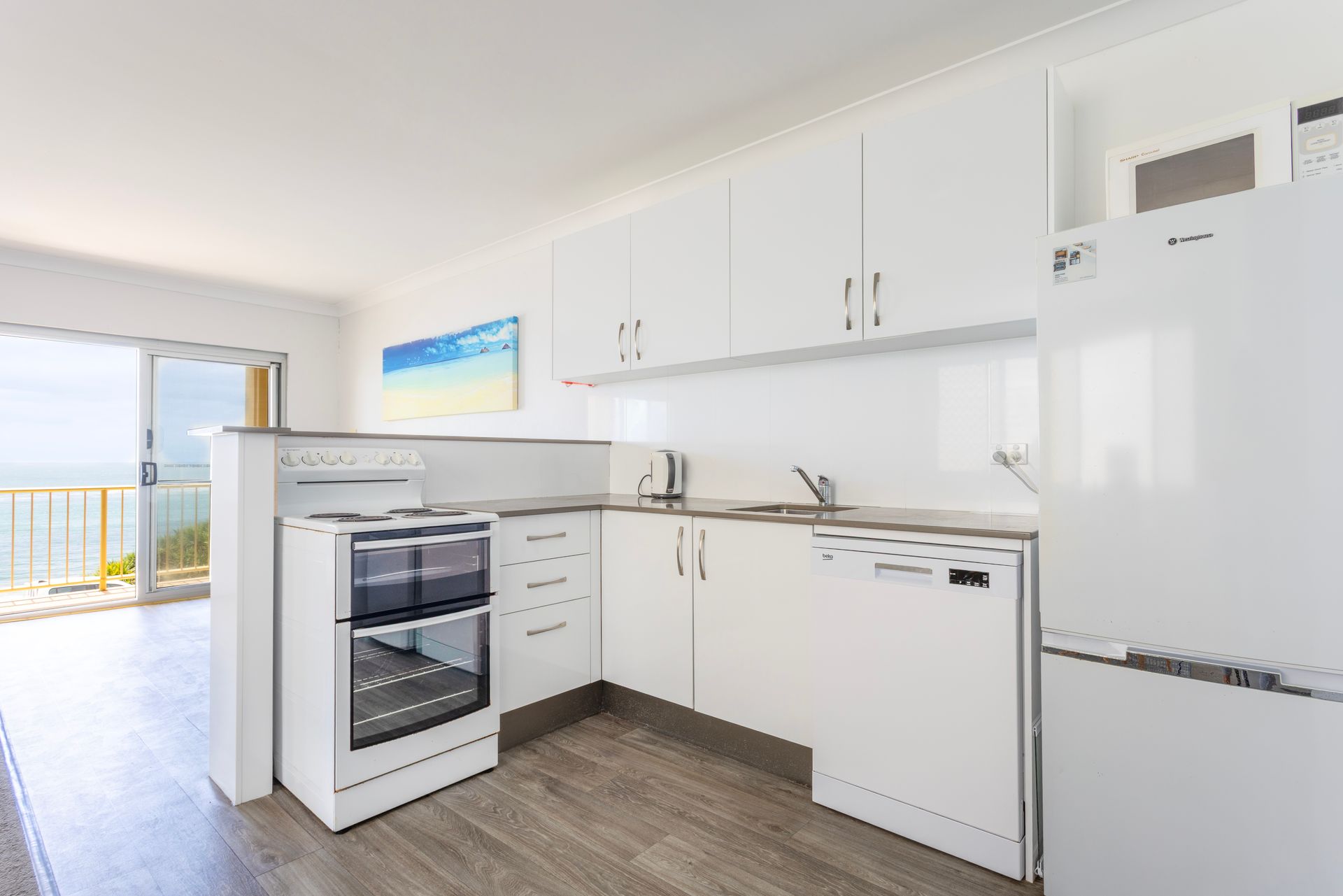 The apartment enjoys beautiful ocean views, which you can take in from the living area or balcony. Inside, the lounge is set up for easy evenings in, with comfortable seating and a large smart TV. The kitchen is modern and well equipped, with everything you need to cook during your stay, including a dishwasher, oven, microwave and fridge.