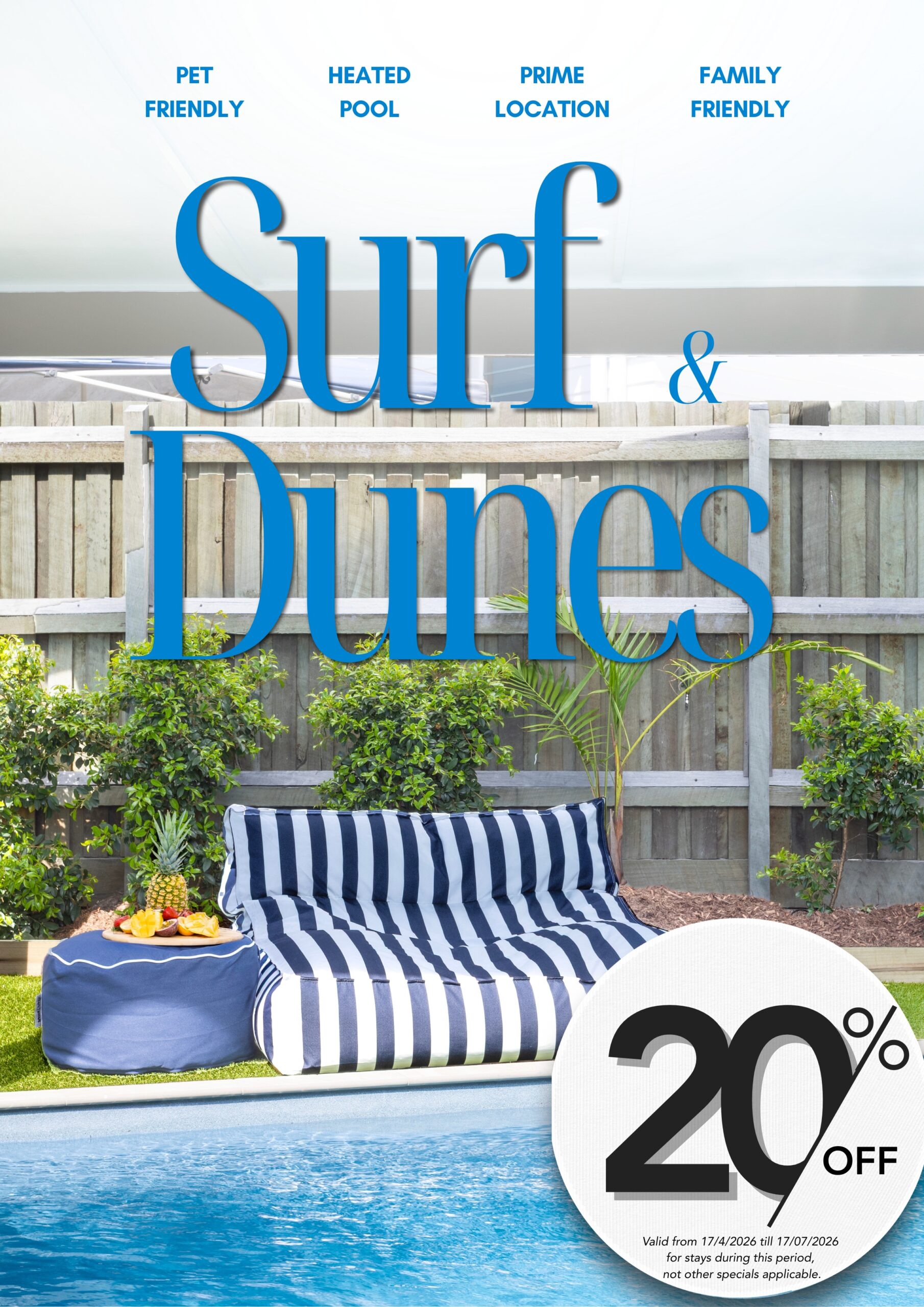 Specials 20% Surf & Dunes Valid from 17/4/2026 till 17/07/2026 for stays during this period, not other specials applicable. Minimum 3-night stays. Autumn Special Deal Available from February 23, 2026 until June 20, 2026. Valid for stays from March 20, 2026 to June 20, 2026
